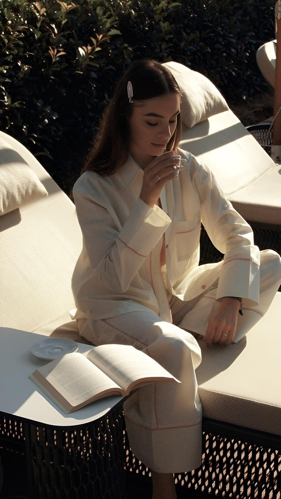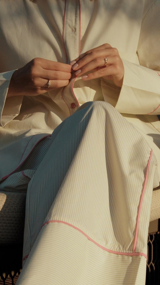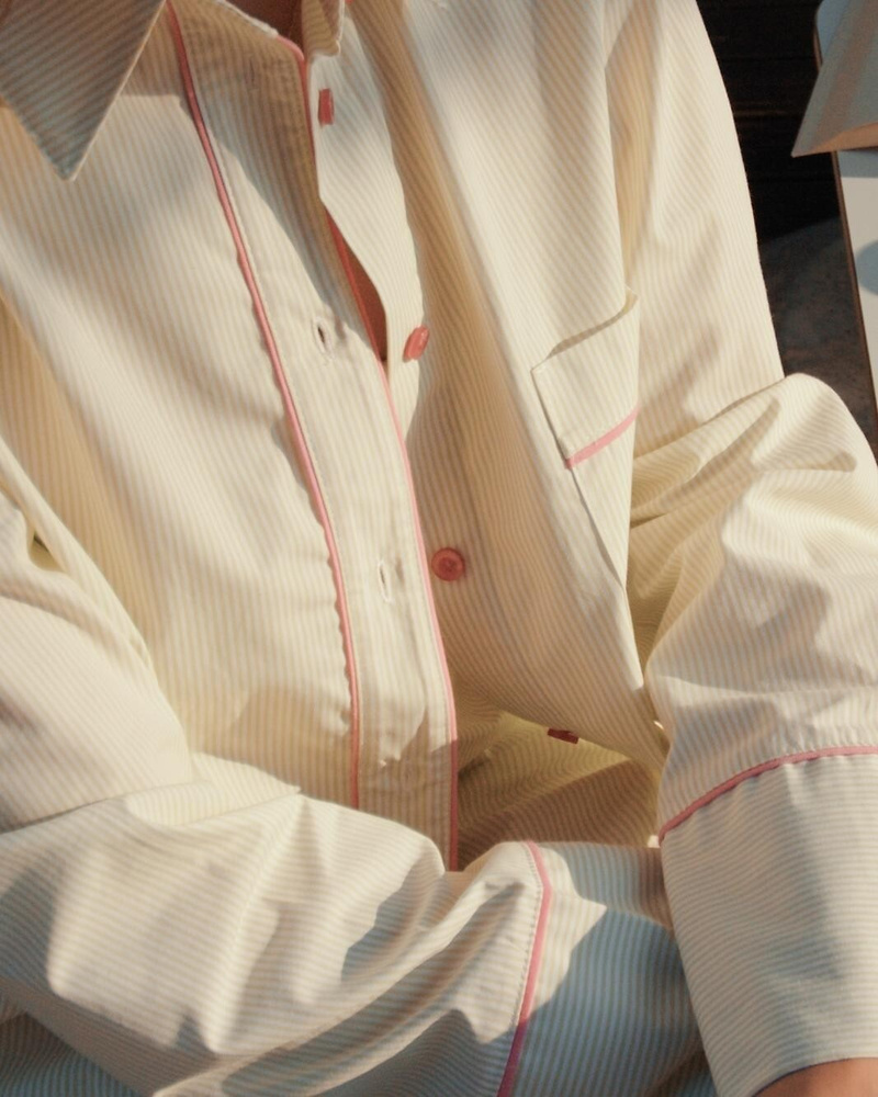 Das Oberteil ist ein Hemd mit langen Ärmeln und feinem Streifenmuster. Der klassische Kragen und die Knopfleiste verleihen dem Pyjama einen gepflegten, zeitlosen Look. Dadurch wirkt das Modell stilvoll und gleichzeitig entspannt – perfekt nicht nur für die Nacht, sondern auch für gemütliche Stunden zu Hause.