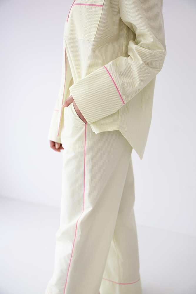 Zum Set gehören lange, gerade geschnittene Hosen, die viel Bewegungsfreiheit bieten. Der elastische Bund ist mit weichem Stoff umnäht und sorgt für eine angenehme Passform ohne Druckgefühl. Praktische Taschen auf Hüfthöhe erhöhen den Komfort im Alltag. Abgerundet wird das Design durch eine dezente rosa Paspelierung, die dem Pyjama einen femininen Akzent verleiht.