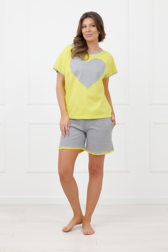 Das Oberteil besteht aus einem Shirt mit lockerem Schnitt und U-Boot-Ausschnitt, der leicht über eine Schulter getragen werden kann. Dieser Schnitt verleiht dem Pyjama eine leichte, feminine Ausstrahlung und sorgt gleichzeitig für angenehme Bewegungsfreiheit. Auf der Vorderseite befindet sich eine kontrastierende Herz-Applikation, die dem Modell einen romantischen Charakter verleiht und als dekoratives Detail ins Auge fällt. Die Ärmel sind mit einer dekorativen Blende in der Farbe des Herzens abgeschlossen, wodurch ein harmonisches Gesamtbild entsteht.