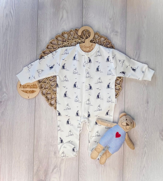 • Weicher Baby-Strampler Mamatti PA16040 mit niedlichem Schiffe-Muster. Atmungsaktive Baumwolle, bequemer Schnitt und praktische Druckknöpfe sorgen für Komfort beim Schlafen und im Alltag. Ideal für die Baby-Erstausstattung.