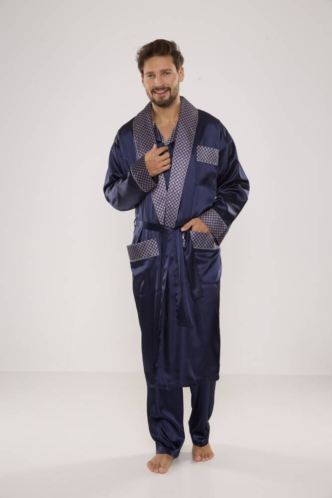 Eleganter Herrenpyjama, lang, ungeknöpft, mit Kragen und Taschen.