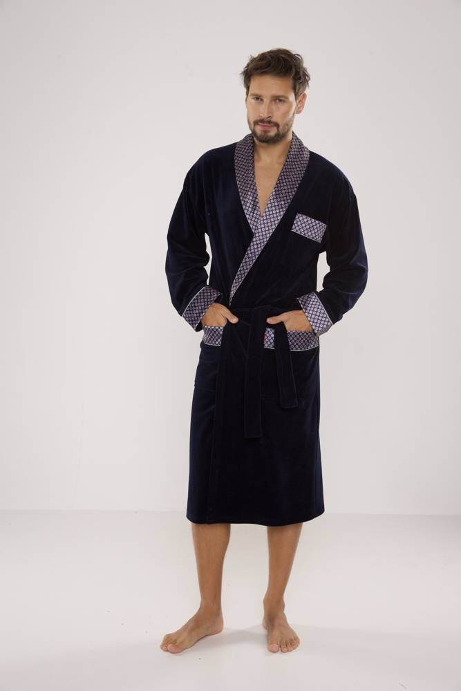 .Langer Herrenmantel aus Velours, mit Schalkragen, Gürtel zum Binden, mit zwei aufgesetzten Taschen und einer kleineren Tasche auf Brusthöhe. Manschetten, Kragen und Taschen aus gemustertem Satin. Es besteht zu 80 % aus Baumwolle, die sich angenehm anfühlt und Wasser perfekt aufnimmt.