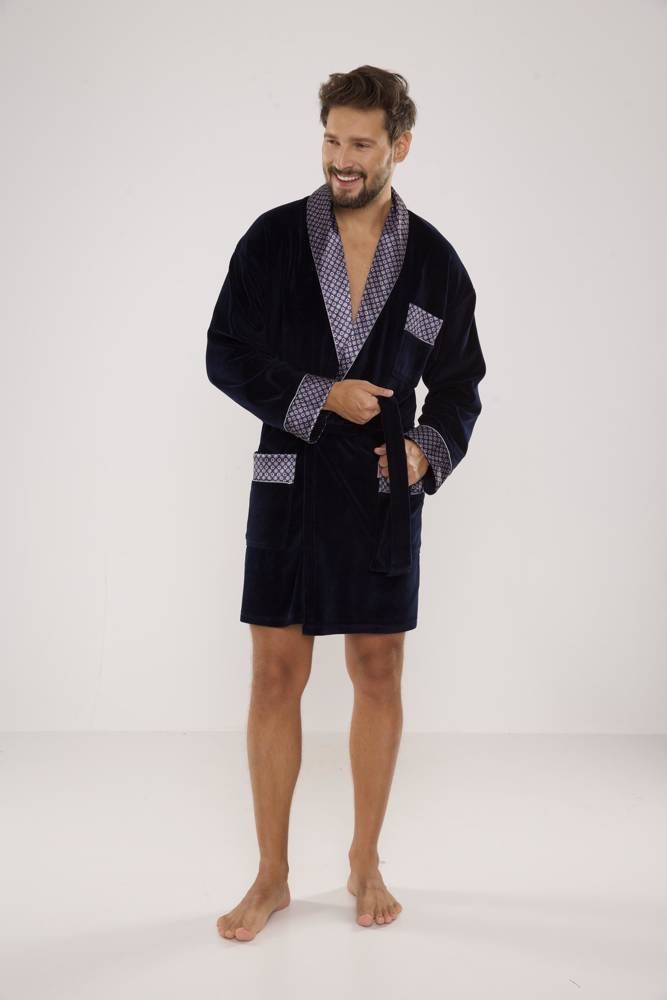 Kurzer Morgenmantel aus Velours für Herren, mit Schalkragen, in der Taille gebunden, mit zwei aufgesetzten Taschen und einer kleineren Tasche auf Brusthöhe. Manschetten, Kragen und Taschen aus gemustertem Satin. Es besteht zu 80 % aus Baumwolle, die sich angenehm anfühlt und Wasser perfekt aufnimmt.