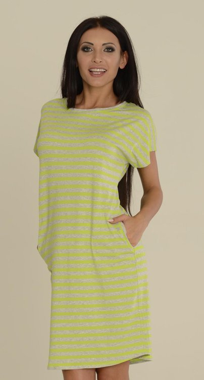 Gestreiftes Damenshirt, kurzarm, mit Taschen. Bootsausschnitt, knielang. Viskose ist ein Material, das sich perfekt an den Körper anpasst, aber auch atmungsaktiv und hautfreundlich ist. Viskosefasern, die eine gute Formgebung garantieren, sind atmungsaktiv und angenehm auf der Haut. Sie sollen die ästhetischen Qualitäten von Seide mit der Pflegeleichtigkeit von Baumwolle verbinden. DAS MATERIAL FÄRBT UND VERFORMT SICH NICHT NACH DEM WASCHEN !!! DAS HEMD IST IN EINEM ELEGANTEN STIL GEMACHT JEDE FRAU WIRD SICH DARIN BESONDERS FÜHLEN !!!