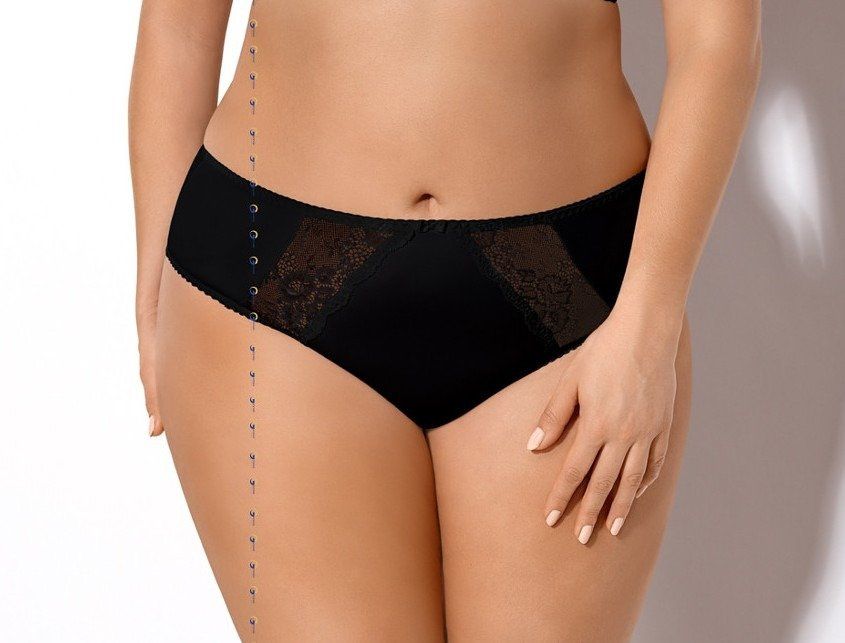 Klassischer Damenschlüpfer, an den Hüften leicht ausgestellt. Hergestellt aus feiner Mikrofaser. Auf der Vorderseite mit floralen Spitzeneinsätzen verziert.