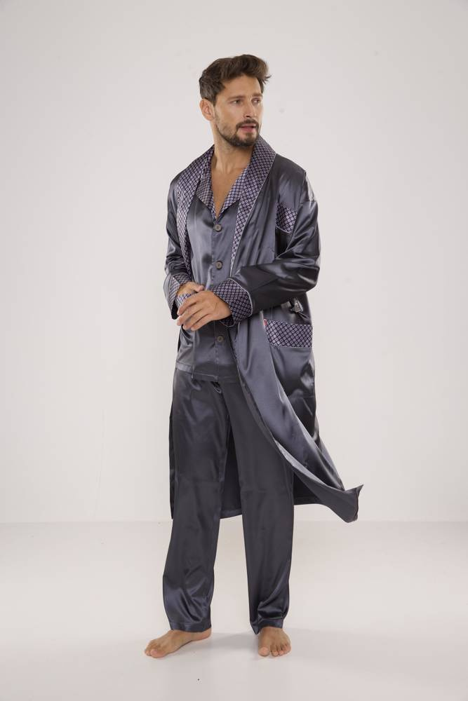 Eleganter Herrenpyjama, lang, ungeknöpft, mit Kragen und Taschen.