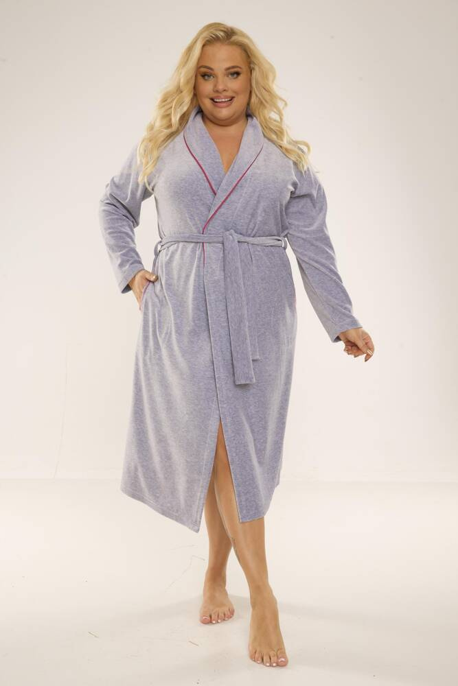 Langer, bequemer Damenbademantel mit Schalkragen. Hergestellt aus angenehmem Velours, das sich gut anfühlt. In der Taille geschnürt, mit Taschen. Mit kontrastfarbenen Paspeln eingefasst.