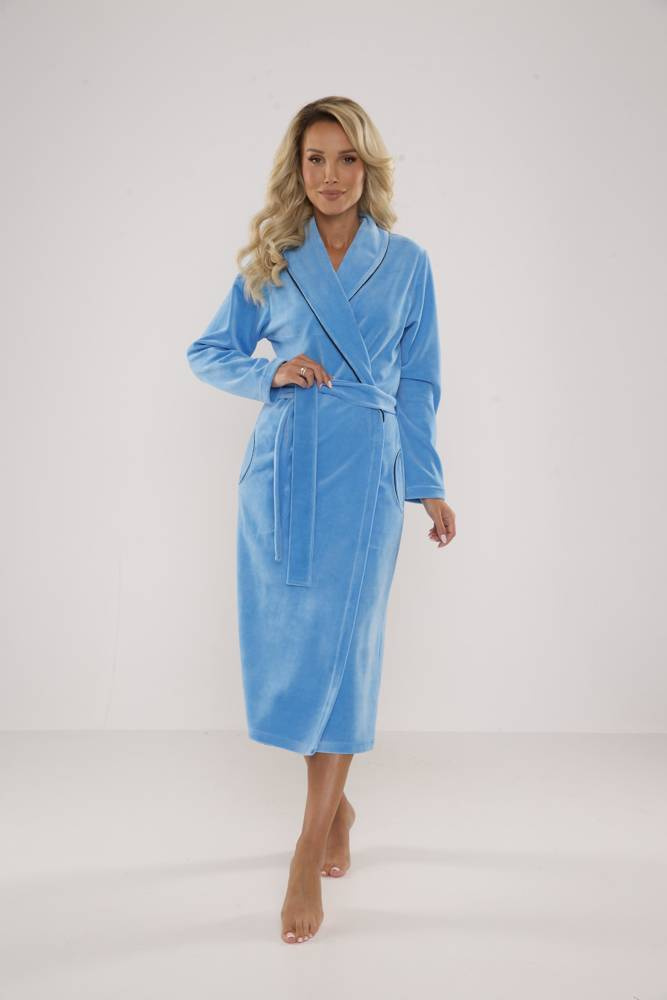 Langer, bequemer Damenbademantel mit Schalkragen. Hergestellt aus angenehmem Velours, das sich gut anfühlt. In der Taille geschnürt, mit Taschen. Mit kontrastfarbenen Paspeln eingefasst.