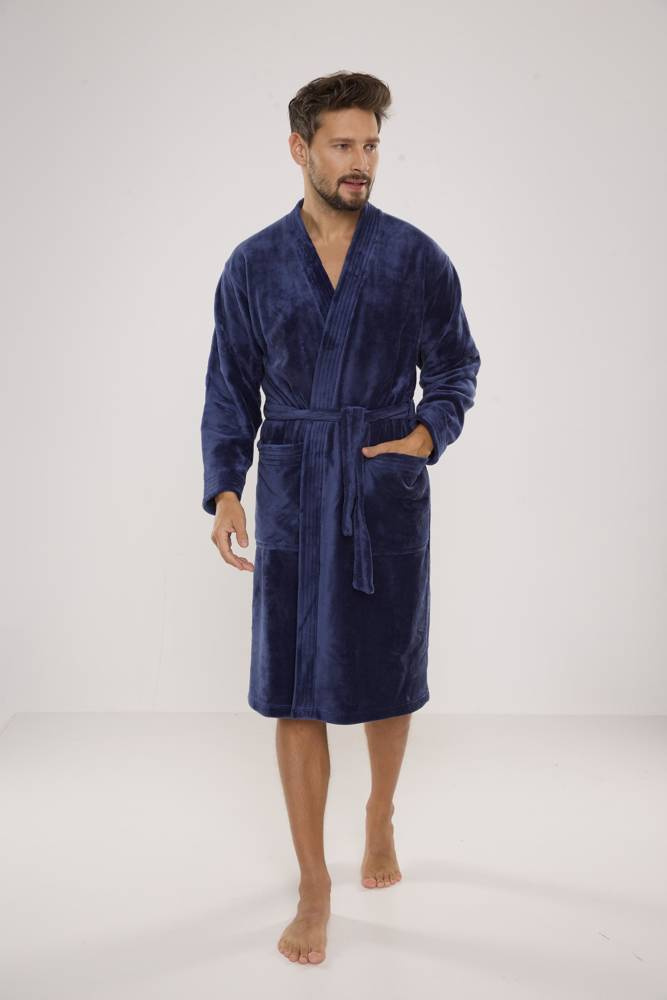 Langer Bademantel für Männer aus weichem Strickstoff. In der Taille geschnürt, Außentaschen auf der Hüfte, aufgenähte Applikation auf Brusthöhe. Angenehmes Tragegefühl, garantierter Tragekomfort. Der Hauptvorteil dieses Modells ist der warme und angenehm zu berührende Plüschstoff, der das Wasser perfekt aufnimmt.