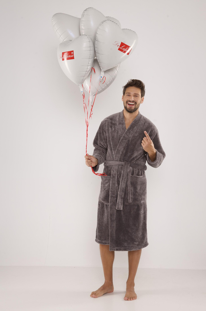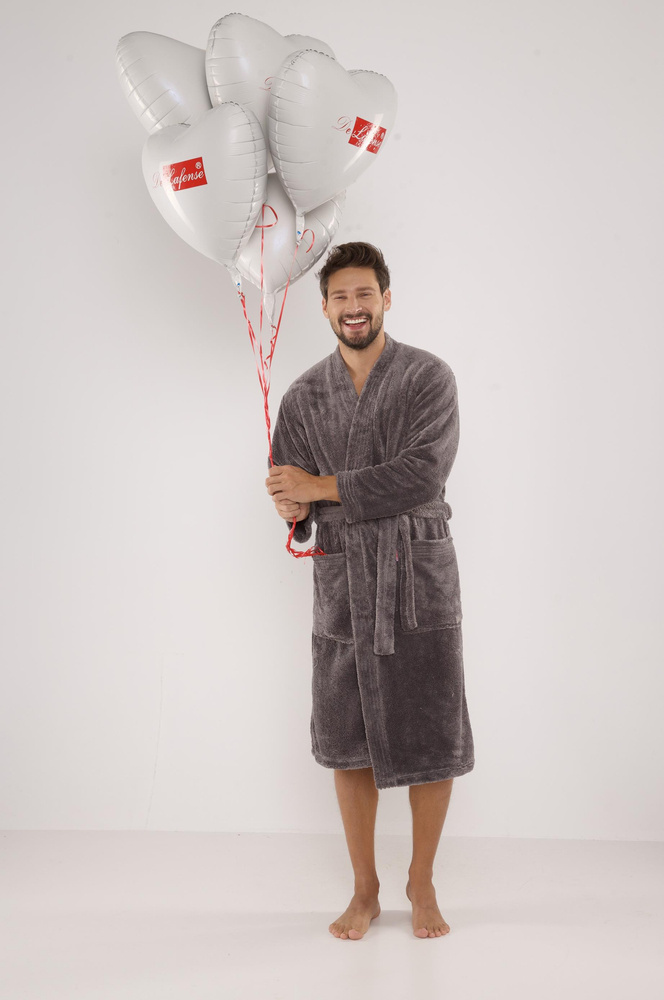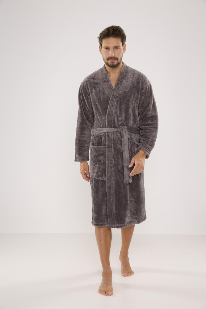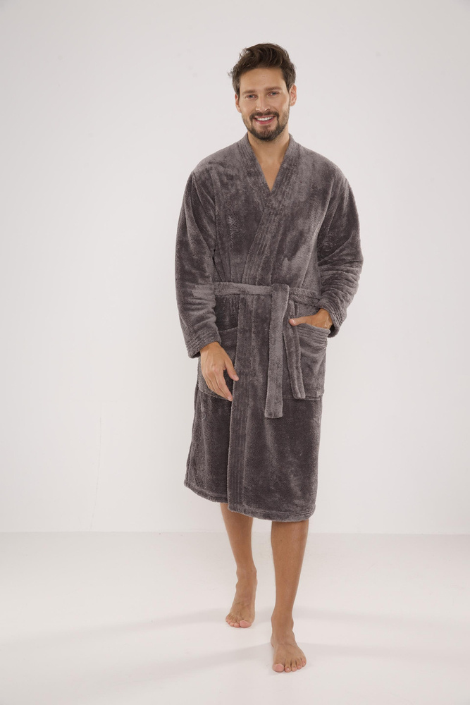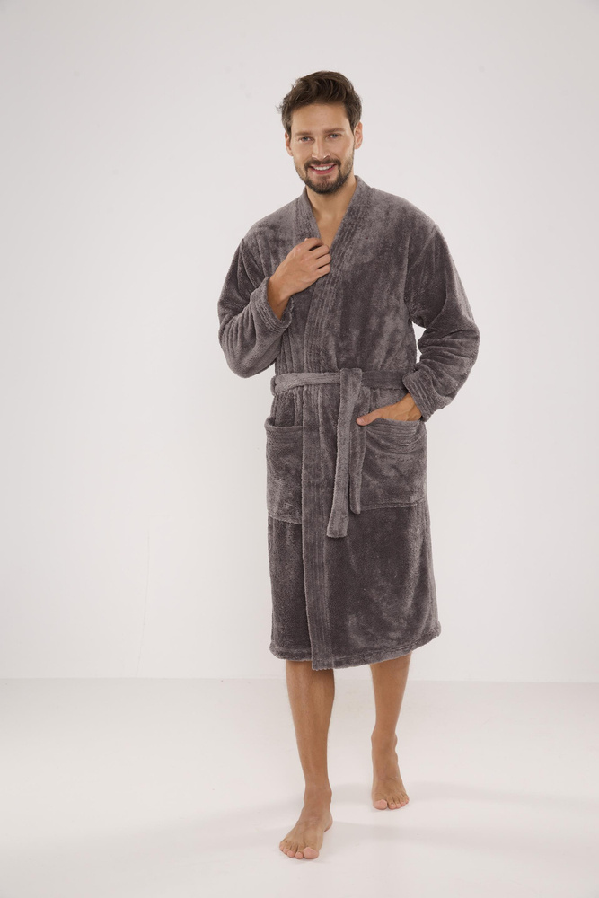 Langer Bademantel für Männer aus weichem Strickstoff. In der Taille geschnürt, Außentaschen auf der Hüfte, aufgenähte Applikation auf Brusthöhe. Angenehmes Tragegefühl, garantierter Tragekomfort. Der Hauptvorteil dieses Modells ist der warme und angenehm zu berührende Plüschstoff, der das Wasser perfekt aufnimmt.