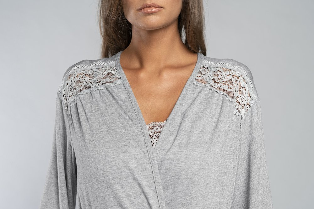 Das Modell hat seitliche Taschen und ein bequemes Band in der Taille. Verziert mit zarter Spitze auf ärmel, oramit Ausschnitt.