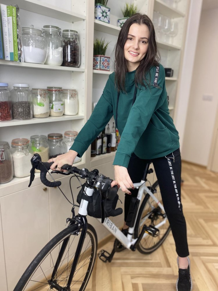 Bequemer Damen-Trainingsanzug aus körperfreundlichem Material. Langärmeliges Sweatshirt mit Kapuze. Auf Bauchhöhe, Tasche. Hose mit Taschen. Gürtel mit Kordelzug. Ärmel und Beine mit Schriftzug verziert.