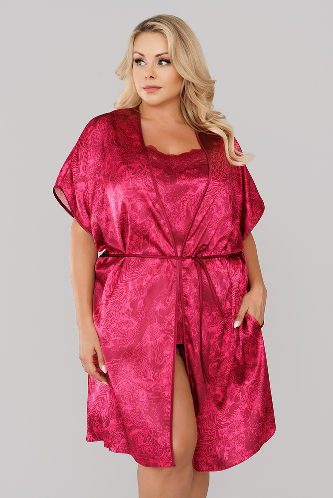 Satin-Morgenmantel Impresja ist eine Garantie für Klasse und Schick. Intensive weinrote Farbe und orientalische Motive - perfekt für ein abendliches Rendezvous mit dem/der Liebsten. Das Bindeband auf der Vorderseite und der tiefe V-Ausschnitt betonen wunderbar Ihre Silhouette. Mit dem Impresja Pyjama oder Hemd können Sie ein einzigartiges und unvergessliches Set zusammenstellen.