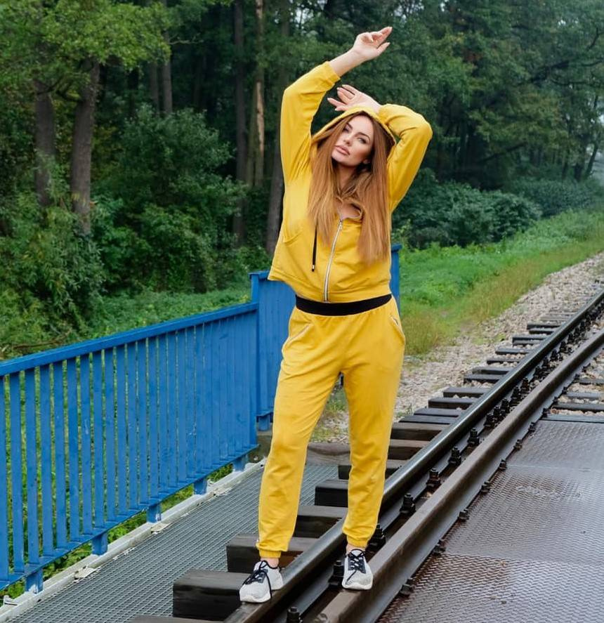 Bequemer Damen-Trainingsanzug aus körperfreundlichem Material. Langärmeliges Sweatshirt mit Kapuze. Große Tasche auf der Vorderseite.