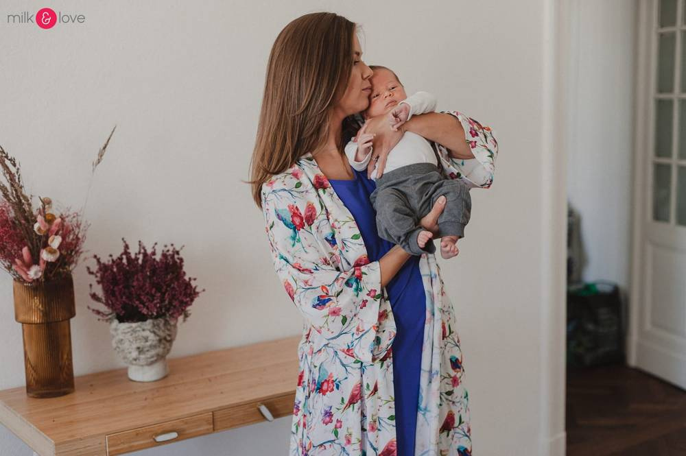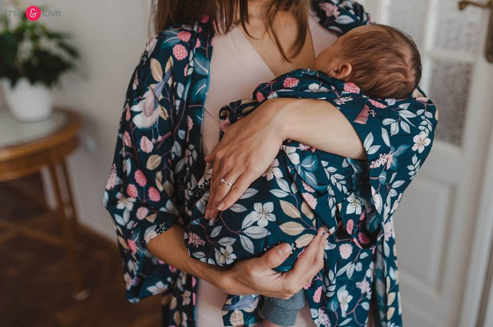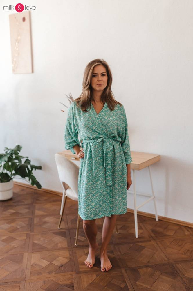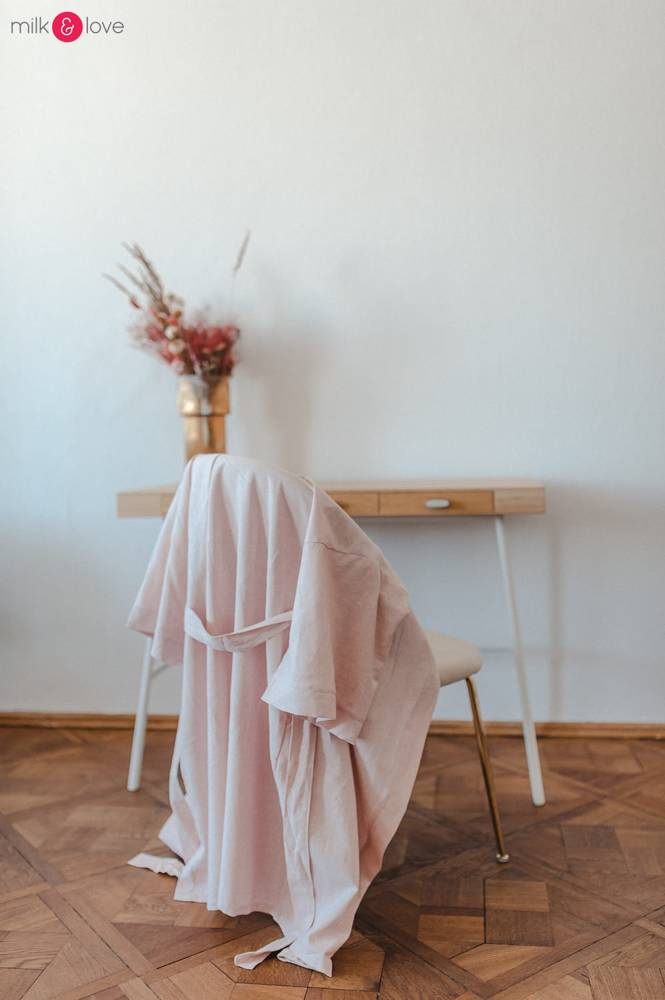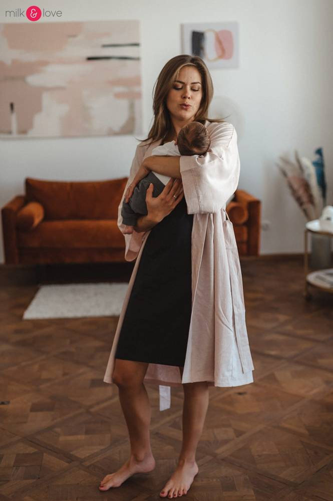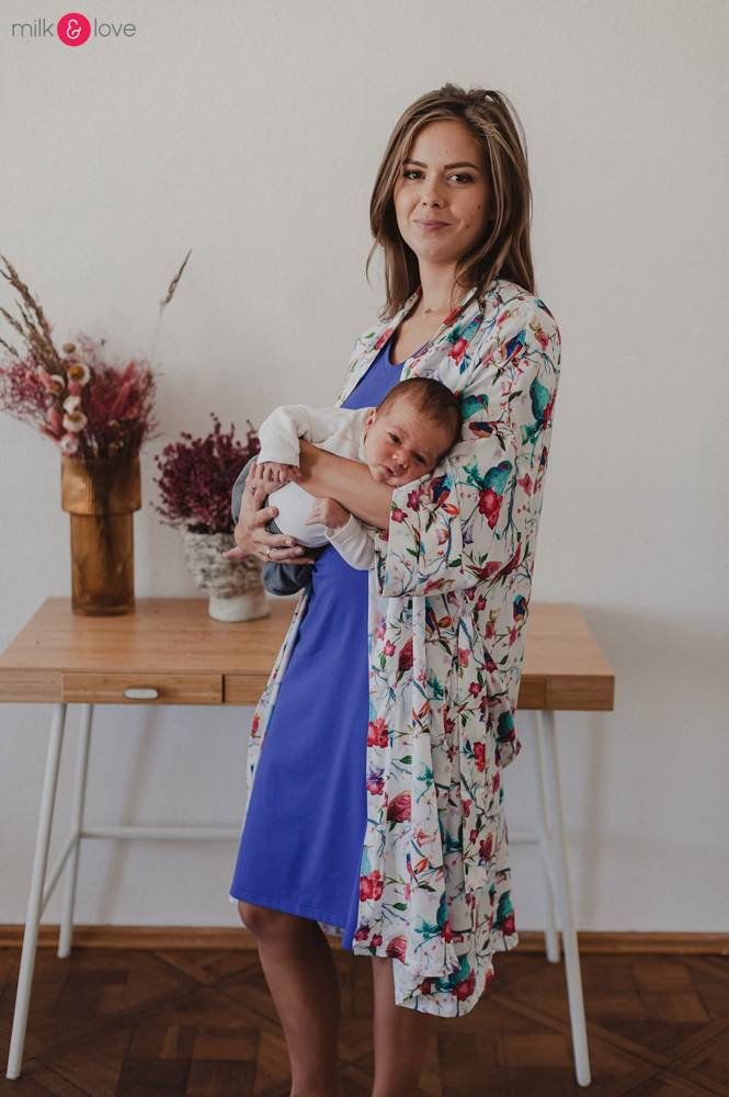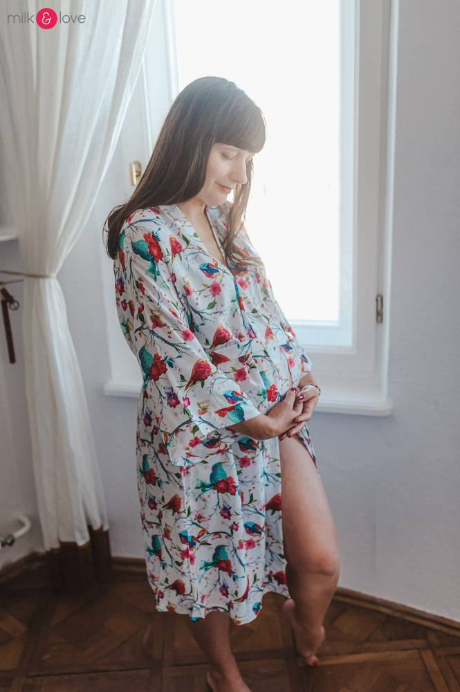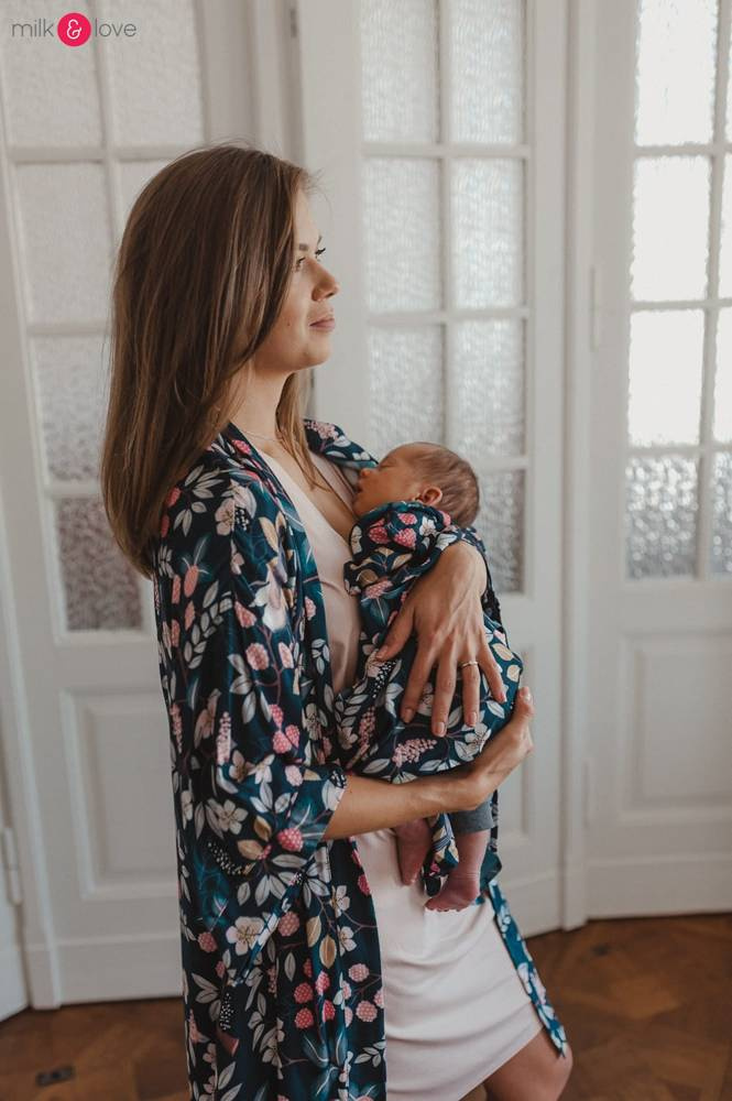 Szlafrok został zaprojektowany z myślą o mamach, dlatego jest nieco dłuższy, abyś spokojnie okryła nim ciążowy brzuszek. Po porodzie bez skrępowania b będziesz mogła spacerować po szpitalnym korytarzu lub na leżąco nakarmiła maluszka w połogu. Posiada kieszenie na niezbędne drobiazgi i pasek do regulowania szerokości.