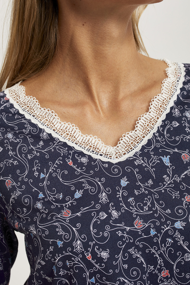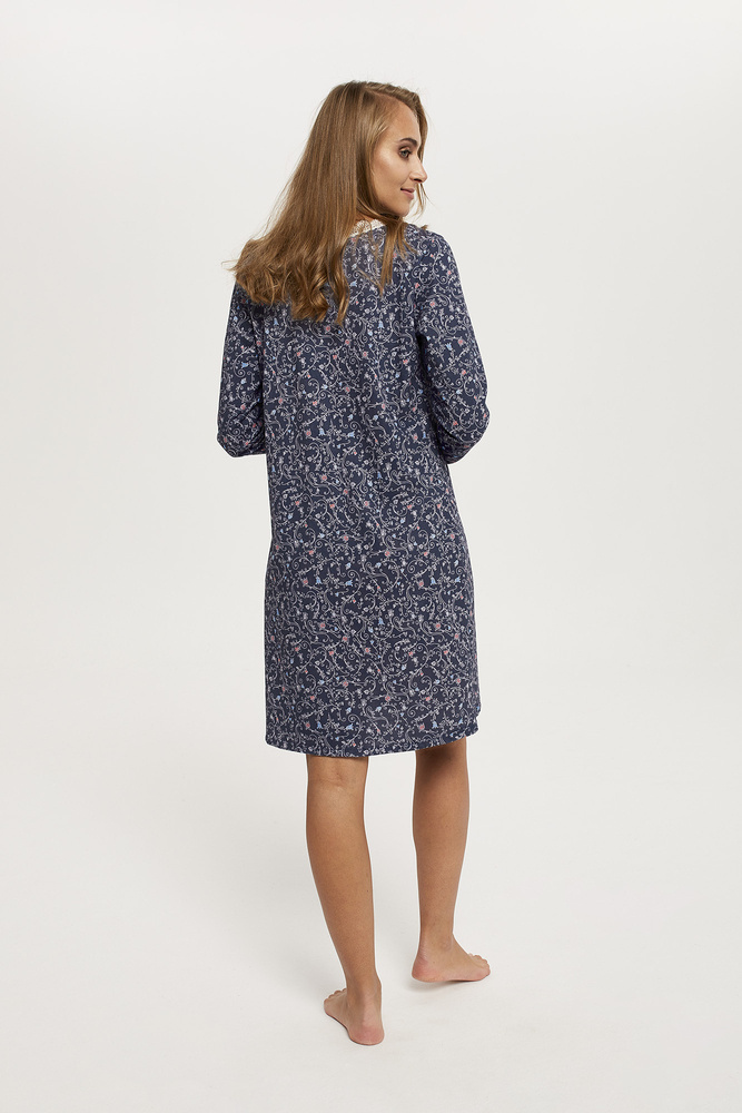 Wzorzysta koszula damska z długim rękawem. Piękny motyw na ciemnym tle przyciąga uwagę i nadaje uroku koszuli. Dekolt został wykończony kontrastową koronką. Długość całkowita koszuli sięga przed kolano. Wysokiej jakości delikatna bawełna, zastosowana do odszycia koszuli, jest bezpieczna i przyjazna dla skóry. Długą wytrzymałość zapewnia jakość użytej tkaniny oraz precyzja jej odszycia.