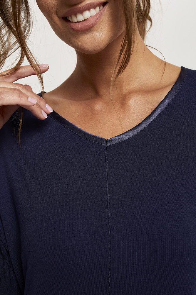 Delikatna piżama damska z rękawem i nogawką o długości 3/4. Wykonana z wiskozy wzbogaconej elastanem. Dostępna w kolorze granatowym. Piżama pięknie prezentuje kobiecą sylwetkę, uwydatniając jej atuty. Góra piżamy została uatrakcyjniona ciekawym przeszyciem na środku przodu, zaś dekolt został wykończony atłasową lamówką w kolorze granatowym, dodając eleganckiego sznytu całości.