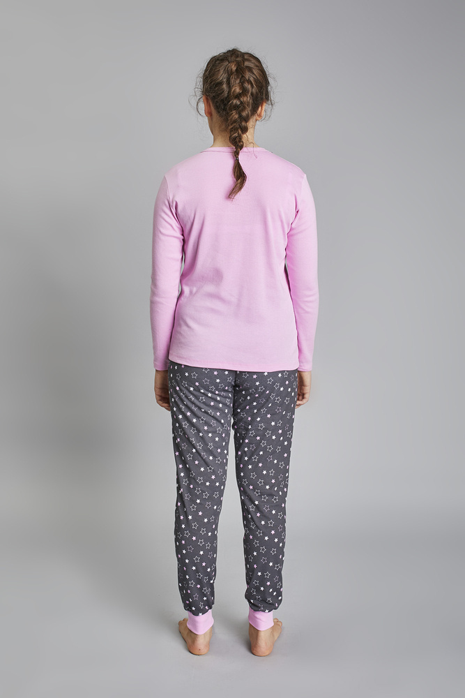 Schlafanzug für Mädchen mit niedlichem T-Shirt-Aufdruck. Hergestellt aus 100 % Baumwolle, bietet es außergewöhnlichen Komfort und garantiert Weichheit und Freude für die Kleinen. Die Pyjamahose ist mit einem gerippten Saum versehen, was sie sehr praktisch und bequem macht.