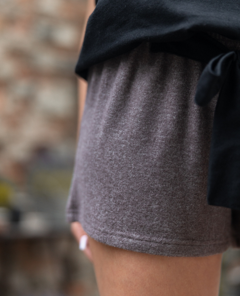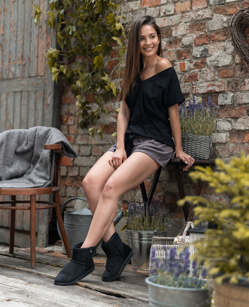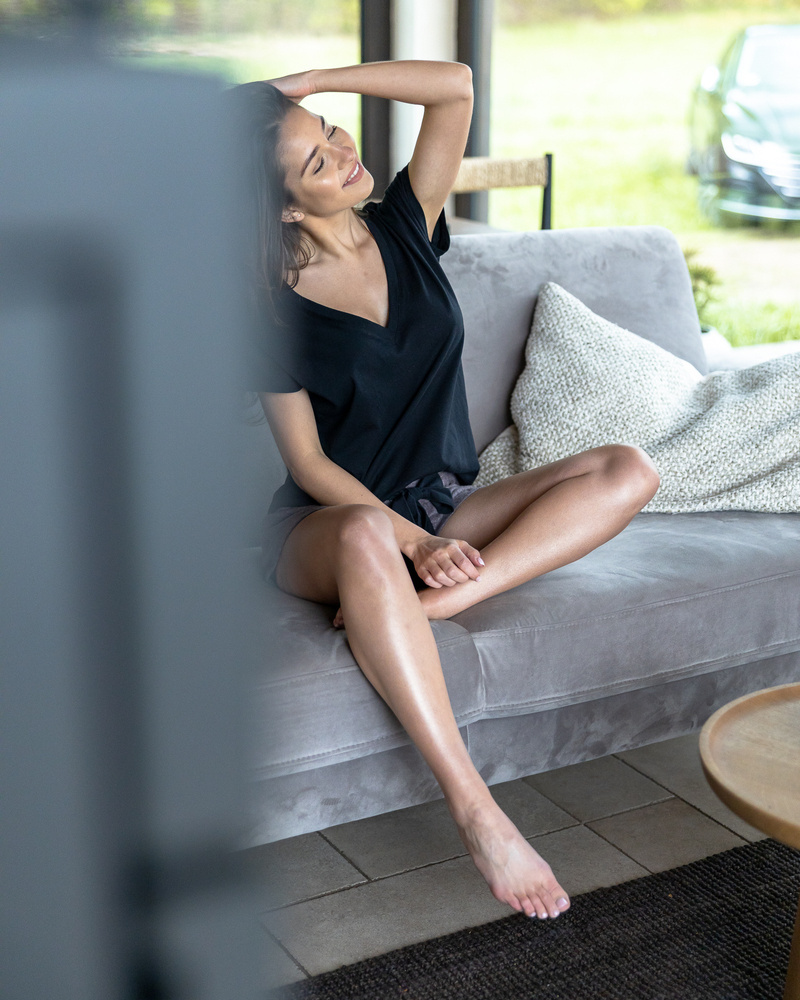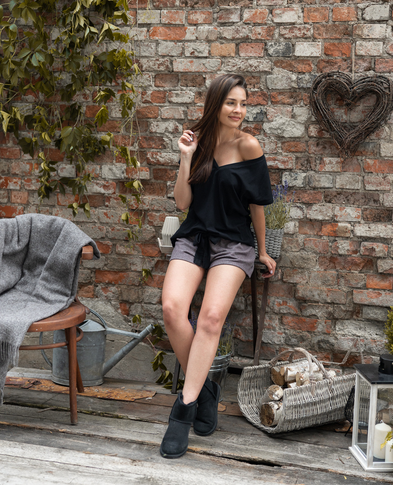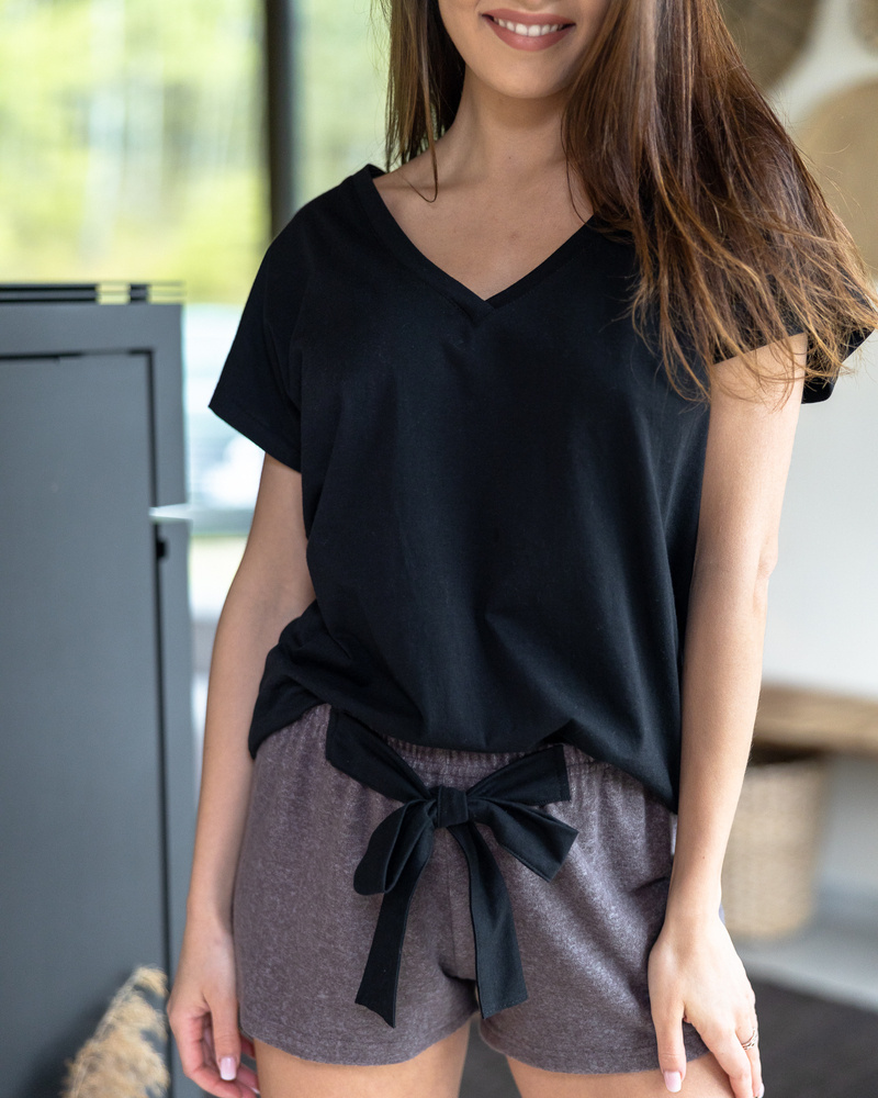 Außergewöhnliche Damenpyjamas - bequem und glamourös. Das Oberteil ist eine Baumwollbluse mit V-Ausschnitt. Dazu süße Shorts aus weichem Viskose-Strickstoff. Bequemer elastischer Bund und Einfassung.