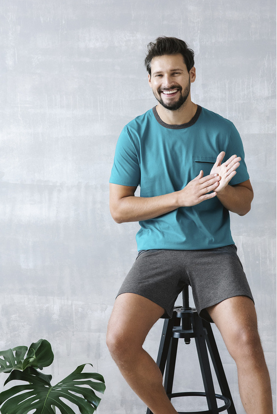 Äußerst angenehm auf der Haut durch die Verwendung von Baumwollstrickwaren für hohen Komfort. Der klassische Schnitt wird für jeden Mann sehr bequem sein. Das navyblaue Oberteil und die gemusterten Shorts bilden ein schönes, klassisches Set.