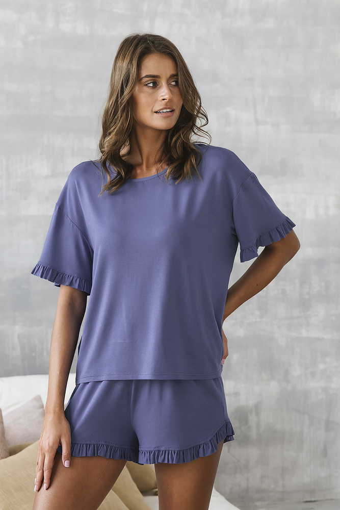 Pyjama Style ist die perfekte Wahl für alle, die einen originellen und eleganten Pyjama suchen. Die leicht drapierte und angenehm zu tragende Viskose reguliert die Körpertemperatur sehr gut. Es passt perfekt auf alle Arten von Figuren. Zarte Rüschen an den Ärmeln und Beinen verleihen diesem Pyjama einen charmanten Touch und machen ihn zu einem echten Hingucker.