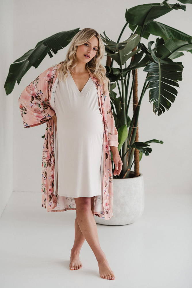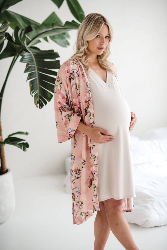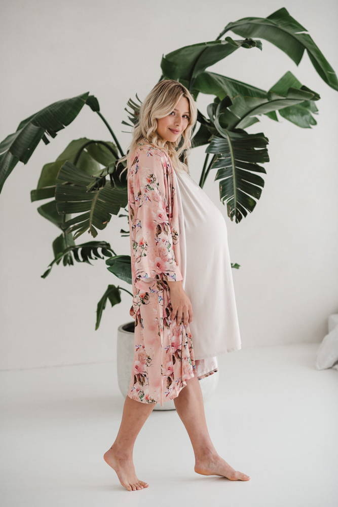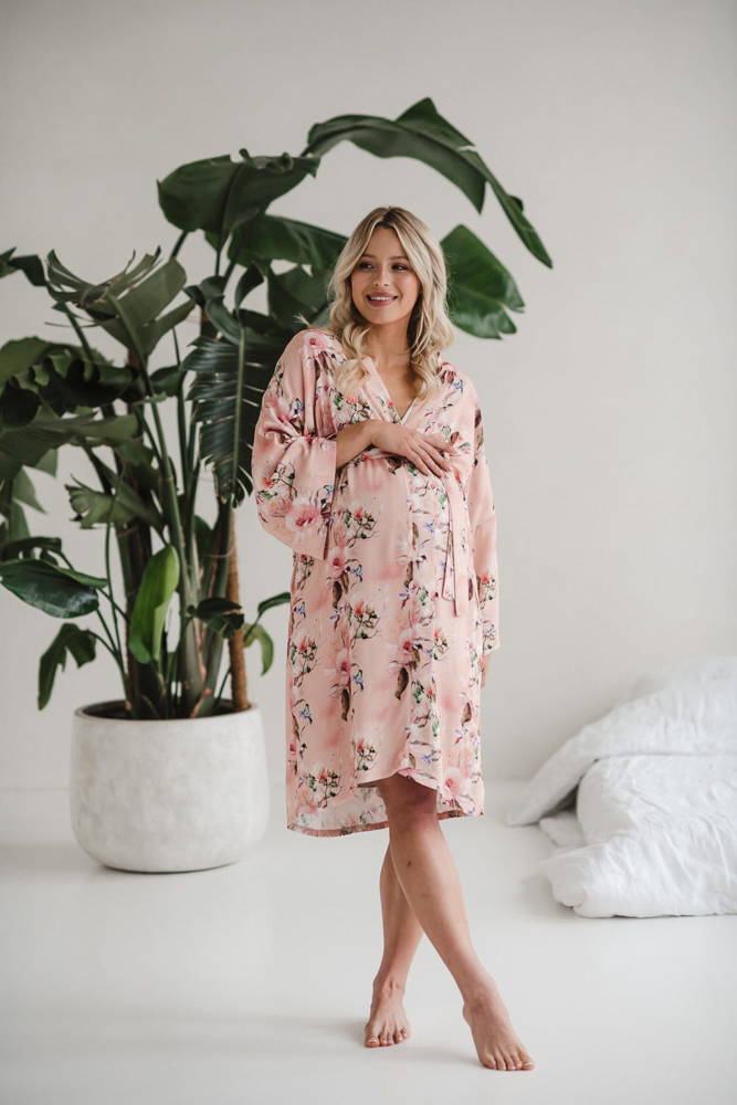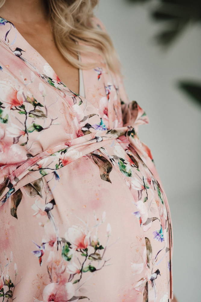 Szlafrok został zaprojektowany z myślą o mamach, dlatego jest nieco dłuższy, abyś spokojnie okryła nim ciążowy brzuszek. Po porodzie bez skrępowania b będziesz mogła spacerować po szpitalnym korytarzu lub na leżąco nakarmiła maluszka w połogu. Posiada kieszenie na niezbędne drobiazgi i pasek do regulowania szerokości.