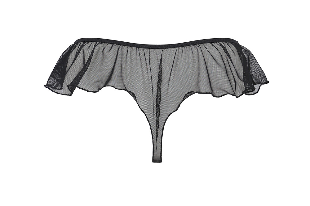 Stringi damskie wykończone falbanką i efektownym haftem.