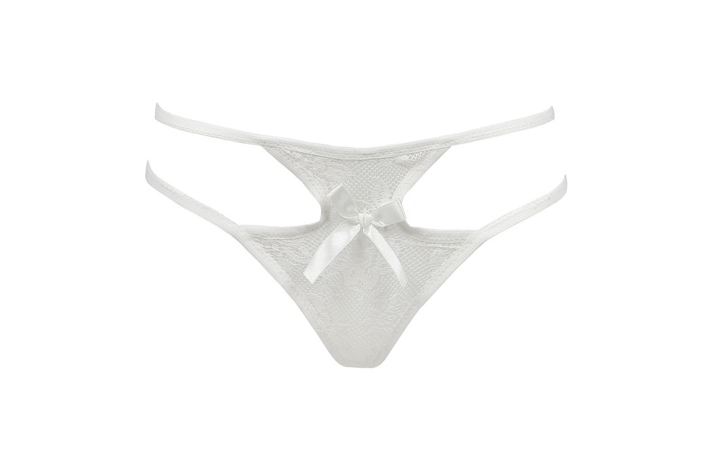 Seksowne stringi z prześwitującej koronki. Na środku ozdobna kokardka.