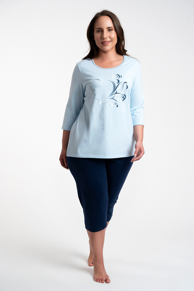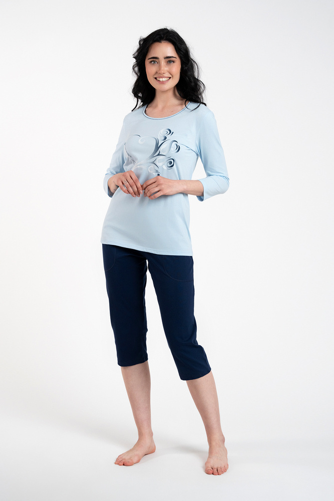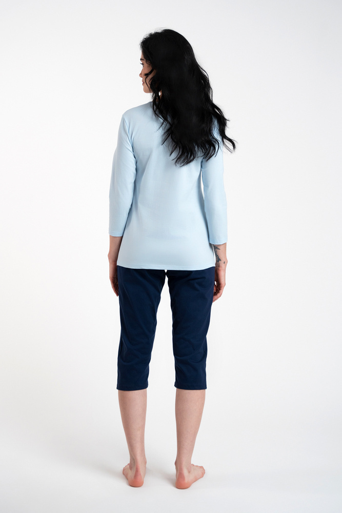 Damenpyjamas in schönen Farben sind eine interessante Wahl für die kommende Saison. Glatte marineblaue 3/4-lange Hose mit druckfreiem Gummibund für Komfort und Bewegungsfreiheit. Das Pyjama-Oberteil ist eine Bluse mit 3/4-Ärmeln. Es ist ein interessantes und zeitloses Muster, das dem Ganzen einen klassischen Ausdruck verleiht.